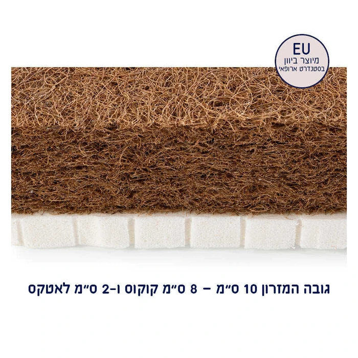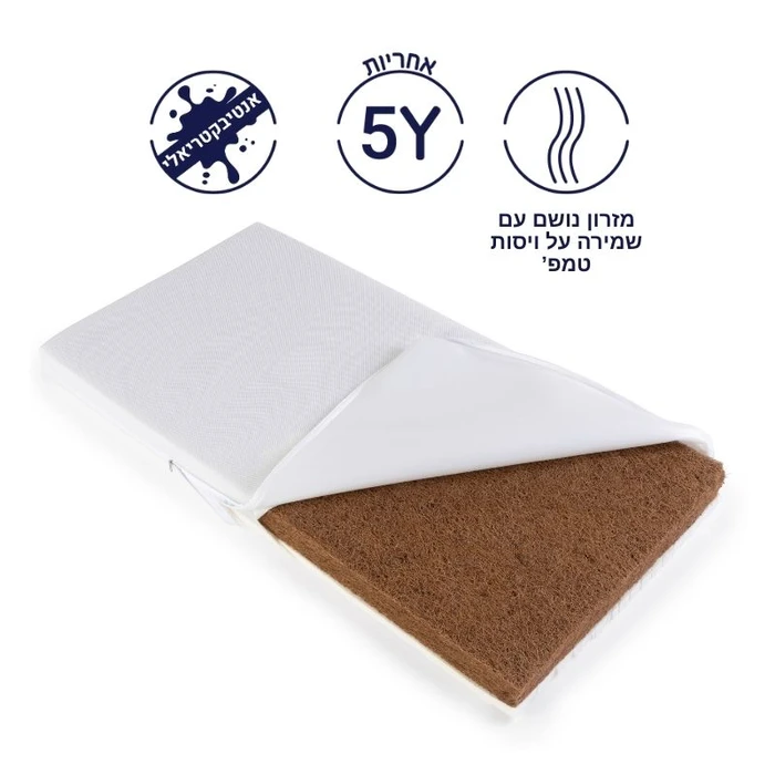 מזרן דו צדדי נושם עם ויסות טמפ' לתינוק המעניק שינה בטוחה טבעית ונושמת, תוך שהוא מספק תמיכה אורטופדית מלאה. גודל המזרן: 127X 63 ס"מ המזרן מיוצר ביוון בסטנדרט אירופאי ובעל אישור תקן של מכון התקנים הישראלי. המזרן בעובי 10 ס"מ מורכב מחומרים טבעיים ונושמים בשתי שכבות : צד קשיח עשוי 8 ס"מ קוקוס טבעי המאפשר ויסות אוורירי ושומר על החום הטבעי של התינוק, וצד רך 2 ס"מ לטקס טבעי לגילאים מתקדמים. כיסוי המזרון תלת ממדי ונושם, מיוצר בטכנולוגיה מתקדמת ומורכב משכבות של סיבים היוצרים מבנה תלת-ממדי, המאפשרות זרימת אוויר חופשית דרך הכיסוי ומונע מעבר נוזלים למזרון. מושלם לשינה מתמשכת, רגועה ובטוחה מהיום הראשון עשוי קוקוס טבעי 8 ס"מ, עם תוחלת חיים ארוכה ויציבה המספקת נוחות וגמישות לגוף התינוק.