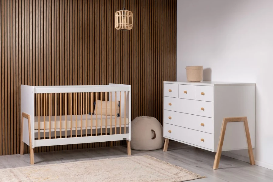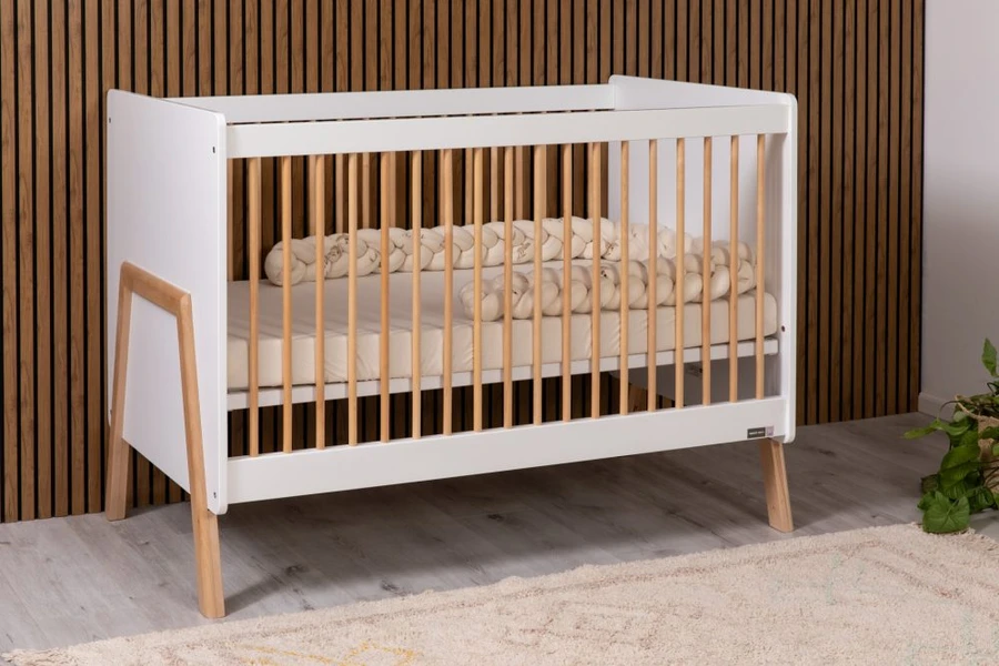 מיטת תינוק בעלת רגליים יחודיות העשויות מעץ מלא ותואמות את השידה. צידי המיטה משופעות בחומר גלם אשר מעניק למיטה חוזק ונראות בלתי מתפשרים.