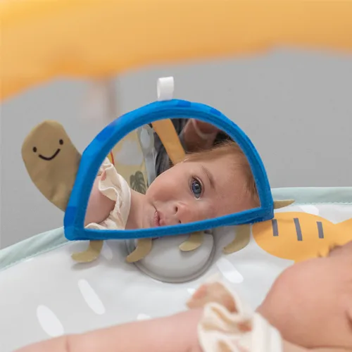 למרכז מחזיקי פלסטיק ייחודיים המסייעים במיקום הכרטיסים הדו-צדדיים והמראה על המחצלת. שילוב זה מעודד את התינוק להישאר על הבטן למשך זמן רב יותר.